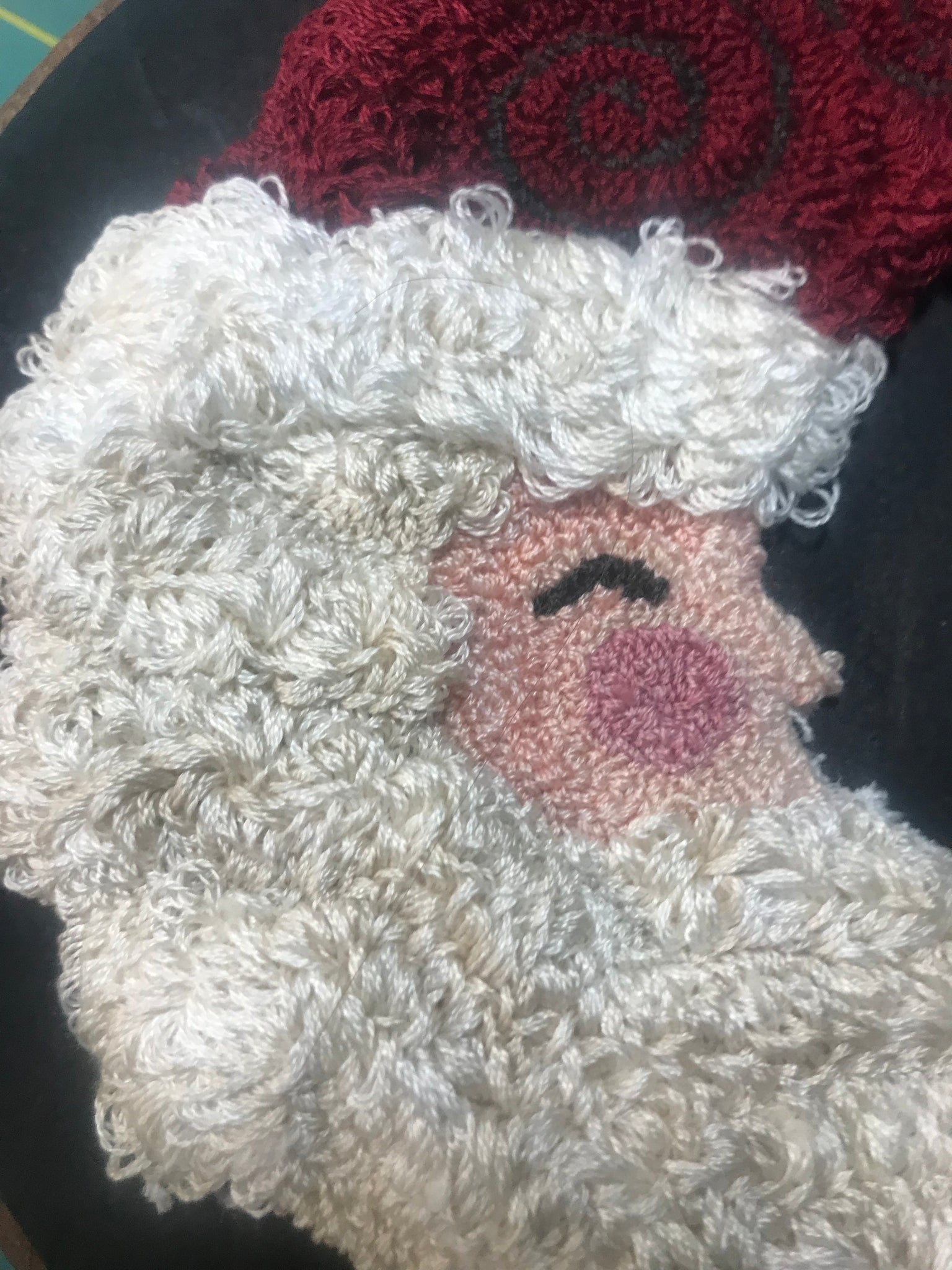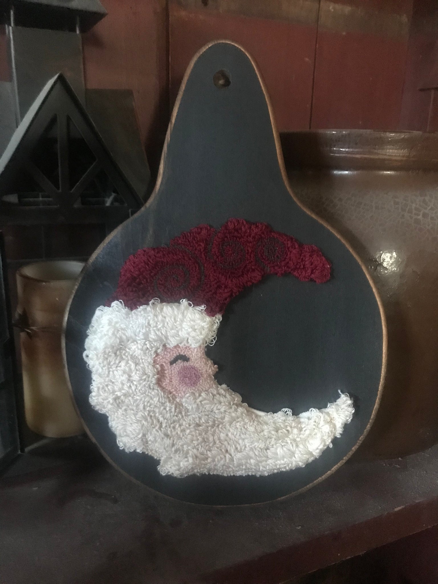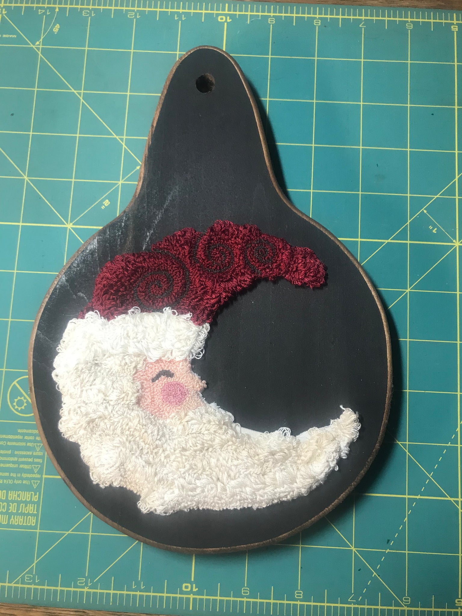 Pere Noel designed by Erin Raatjes of Myrtle Grace Motifs. Just shy of 10” tall by 6.5” wide. All punched by me using Weeks Dye Works thread. Varying heights add texture to his beard and hat. My husband cut out the board and I painted and distressed it. Thank you for allowing me to share my creativity.