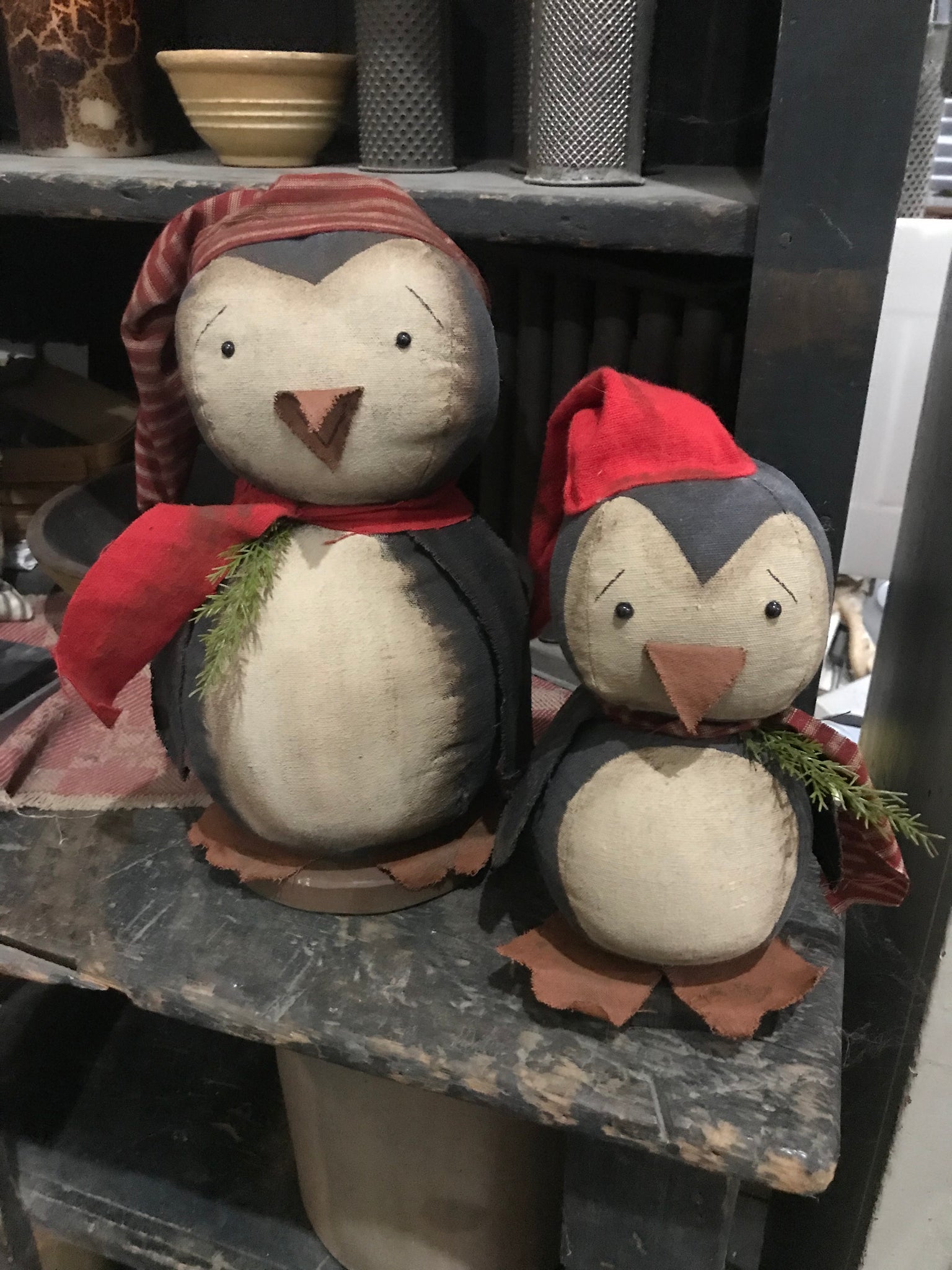 Standing on a wood board at 10” tall. Little baby penguin has a red flannel hat and red ticking scarf. Hand made in the USA