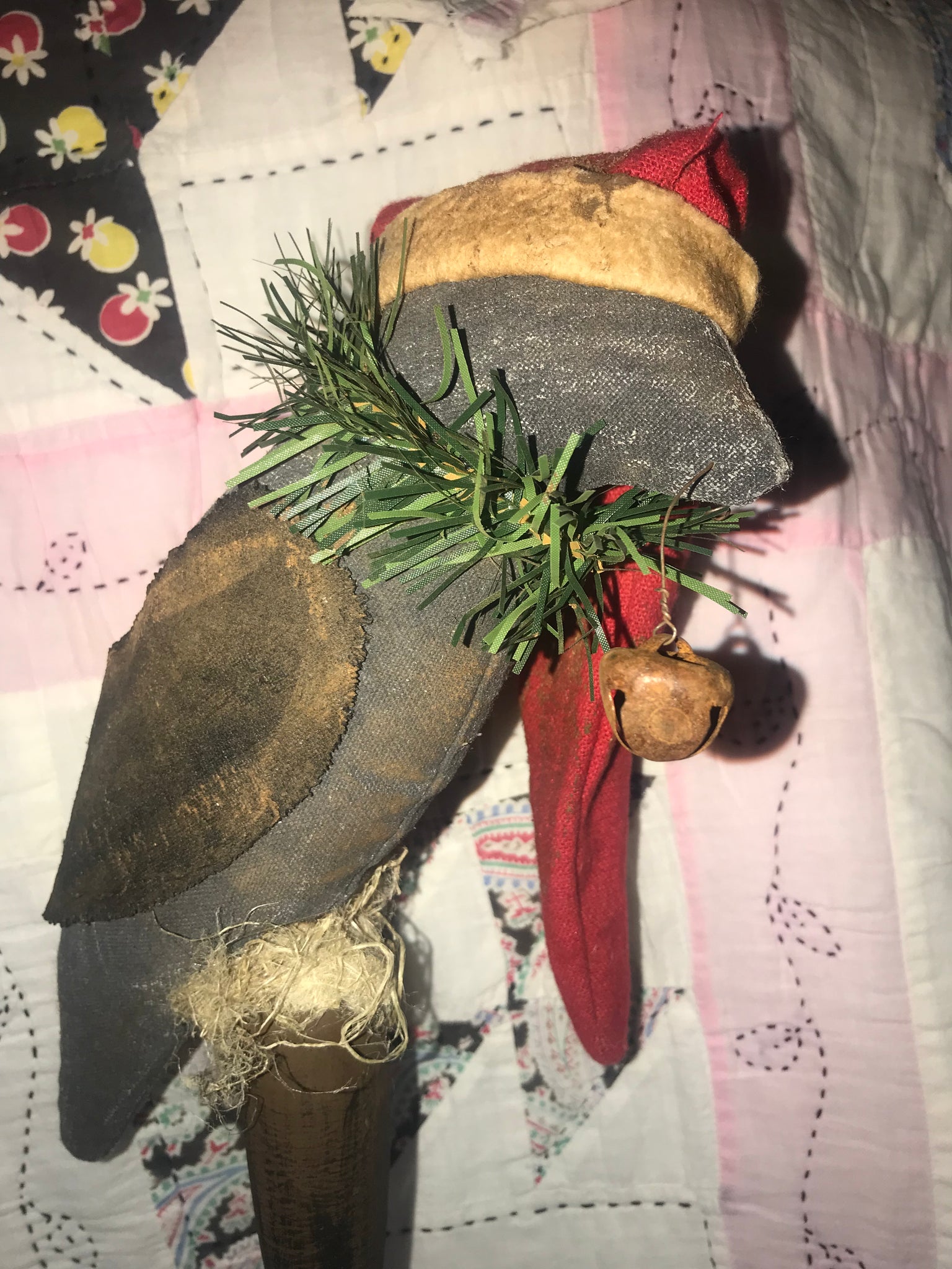 Perched on a grubby, wooden spindle. This grungy crow holds a Rusty bell in its beak and greenery around its neck. A grubby Santa hat is atop its head. 19” tall. Handmade in the USA.