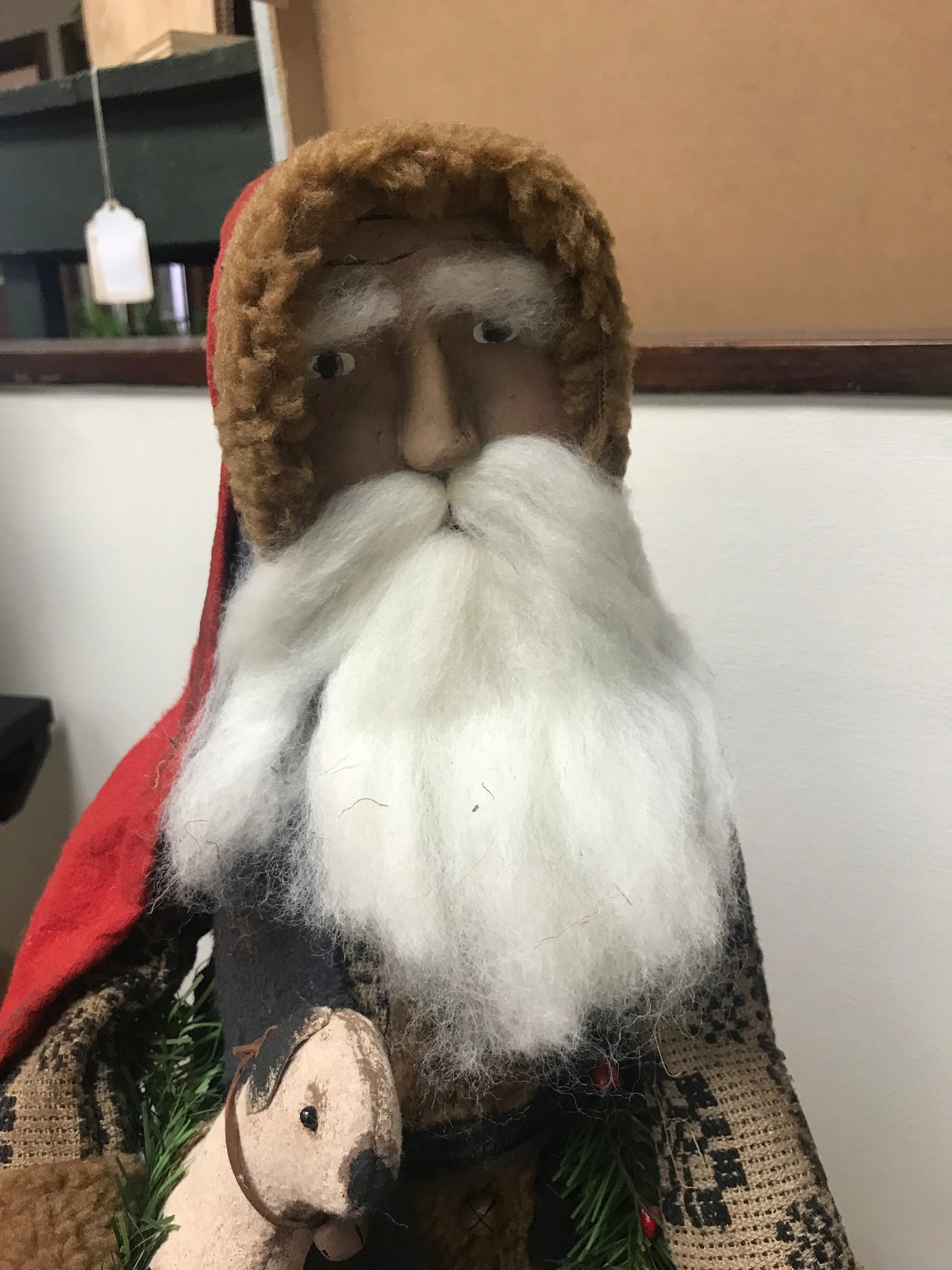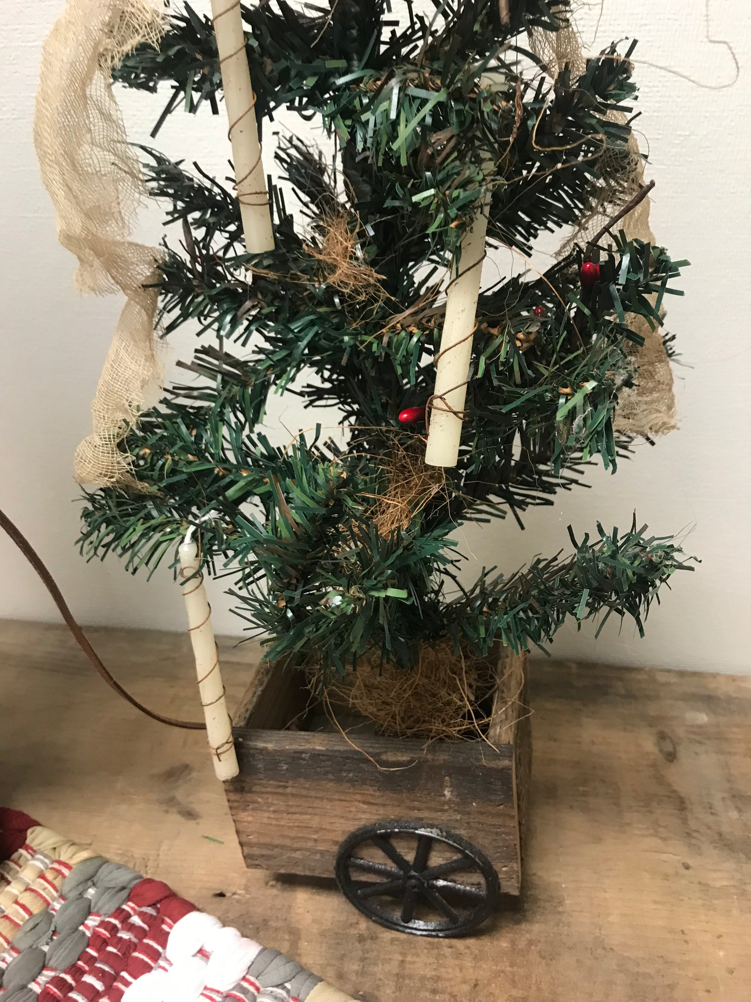 21” tall, tree is 19” tall. His tree is in homemade wood cart with candles hanging from the tree. Carrying his little sheep.  handmade in the USA